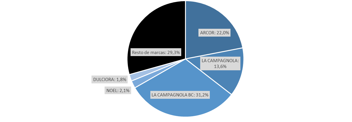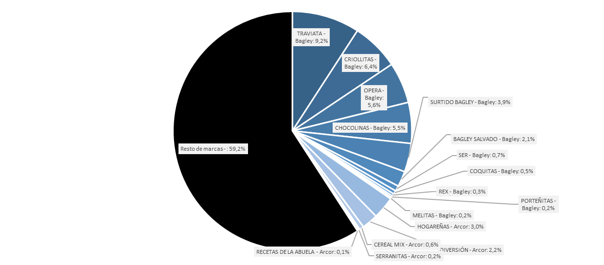 En resumen, la empresa Arcor desempeña y organiza sus negocios en Argentina, Brasil, región andina (Chile, Perú, Ecuador y Colombia), Norte, Centro y Overseas (incluye, México, EEUU, España y China), Filiales Sur (incluye a Uruguay, Paraguay y Bolivia)(4) y Resto de Países y Negocios, cubre el 12,5% de las ventas totales de Supermercados (dato CEPA para 2018 (5)), posee las marcas Traviata, Criollitas, Opera, Chocolinas, Surtidos Bagley, Bagley Salvado, Ser, Coquitas, Rex, Porteñitas, Melitas, Hogareñas, Diversión, Cereal Mix, Serranitas, Recetas de la Abuela (en galletitas), La Serenísima, Armonía, Finlandia, Granja Iris, Casanto y Ser (en lácteos), Arcor, La Campagnola, La Campagnola BC, Noel y Dulciora (en enlatados, aceites, dulces, jugos y otros).