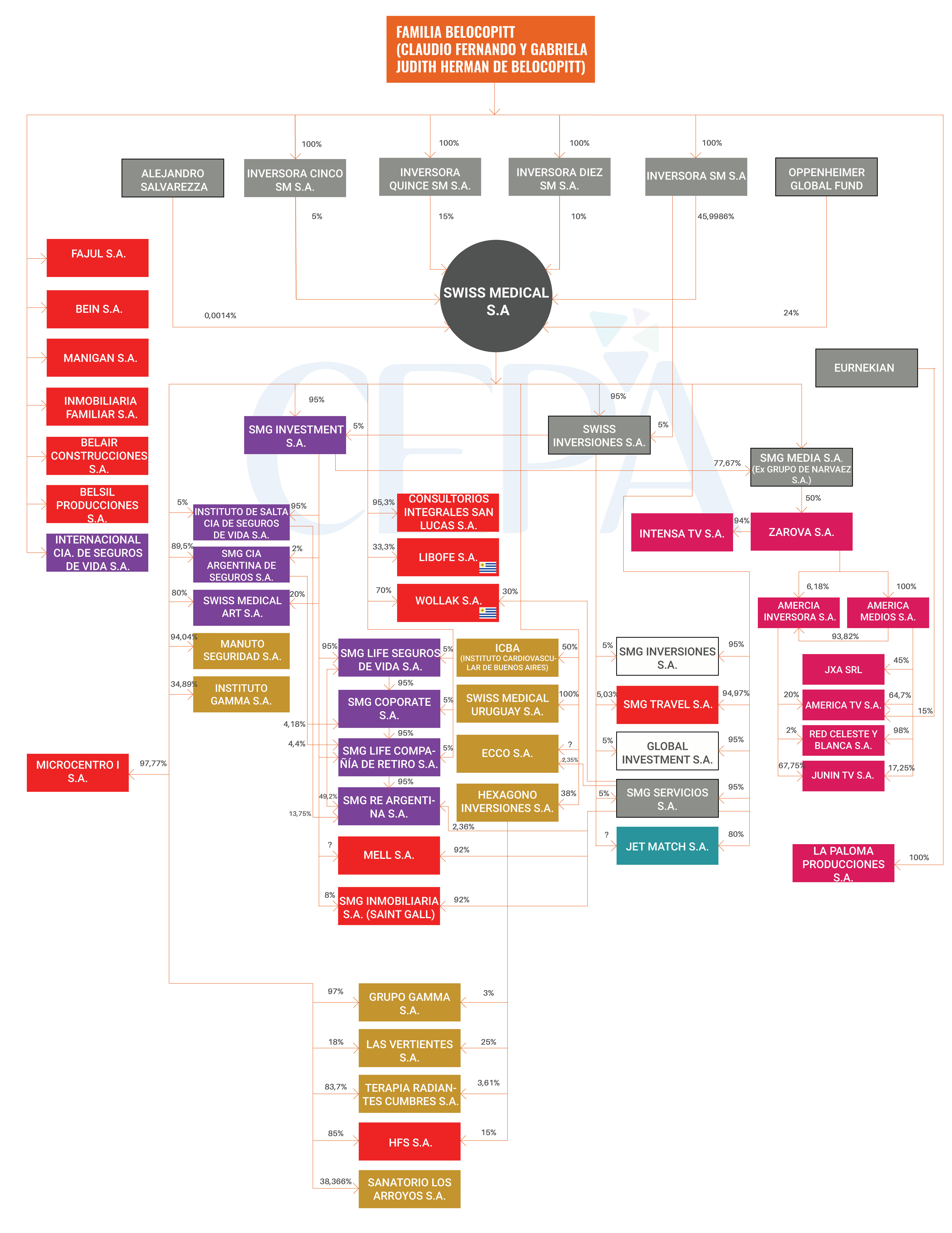 Por otro lado, en lo referido a medios de comunicación, Swiss Medical es controlante de SMG Media SA, anteriormente Grupo De Narváez SA, que a su vez es propietaria del 50% de Zarova SA. Esta sociedad es la cabeza del segmento Comunicaciones. Posee en forma directa el 6,18% de América Inversora SA y el 93,82% en forma indirecta a través de América Medios SA. Dependiendo de estas dos últimas sociedades se estructura un grupo de empresas vinculadas a la comunicación: JXA SRL, América TV SA, Red Celeste y Blanca SA y Junín TV SA. A esta actividad se adiciona la empresa La Paloma Producciones SA que pertenece a la familia Belocopitt de manera directa.