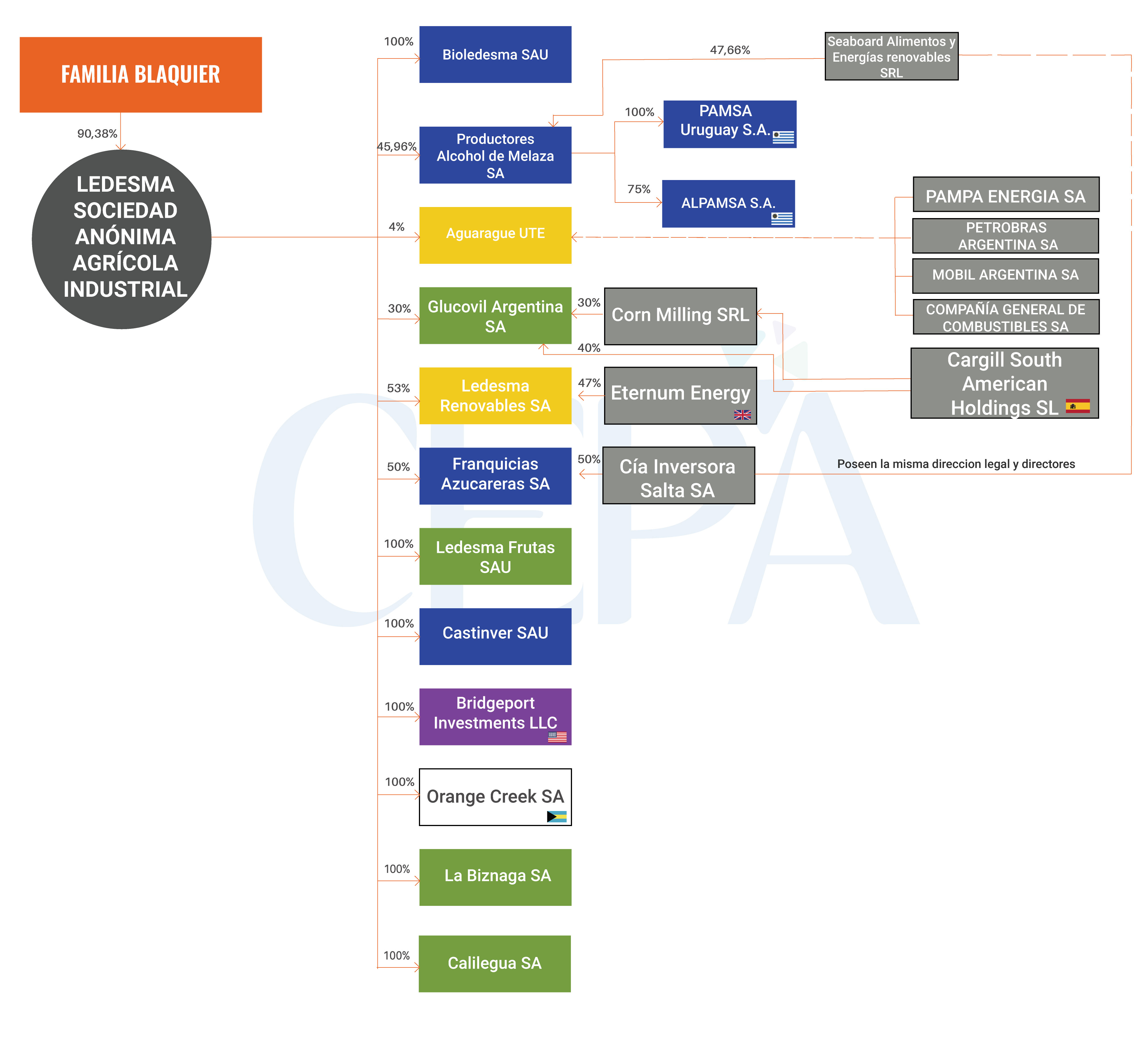 Estas dos sociedades, Seaboard Energías Renovables y Alimentos SRL y Compañía Inversora Salta, tienen la característica de compartir dirección legal y directores, pero no se pudo identificar quiénes son sus dueños, por lo que podría especularse que se trata de la misma familia. Dichas sociedades poseen respectivamente 47,66% y 50% de las empresas mencionadas, siendo la otra mitad propiedad de Ledesma SA.