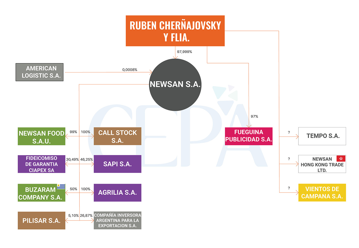Cherñajovsky y su familia ostentan el control del 97,99% de las acciones de Newsan SA, la empresa madre. Newsan posee participaciones en un variado número de actividades, a través de Newsan Food SA (100%), sociedad que se dedica a la exportación de productos de pesca (participa en toda la cadena) y productos regionales (miel, frutos secos, maní, aceite de maní, etc.); de Call Stocks SA (99%), que tiene por actividad la importación y comercialización de artículos electrodomésticos; de Pilisar SA (5,10%), sociedad que importa y comercializa artículos electrodomésticos; de Fideicomiso de Garantía Ciapex SA (30,49%), que se constituyó como un fideicomiso de inversiones financieras; de SAPI SA (46,25%), sociedad administradora de fideicomisos; de Buzaram Company SA –Uruguay− (50%), cuya actividad corresponde a trading de pescado; de Agrilia SA (100%), sociedad inversora uruguaya; de Compañía Inversora Argentina para la Exportación SA (26,87%), dedicada a la inversión en sociedades; de Fueguina Publicidad SA (97%), empresa dedicada a servicios publicitarios; de Vientos de Campana SA; y de Tempo SA y Newsan Hong Kong Trade LTD.