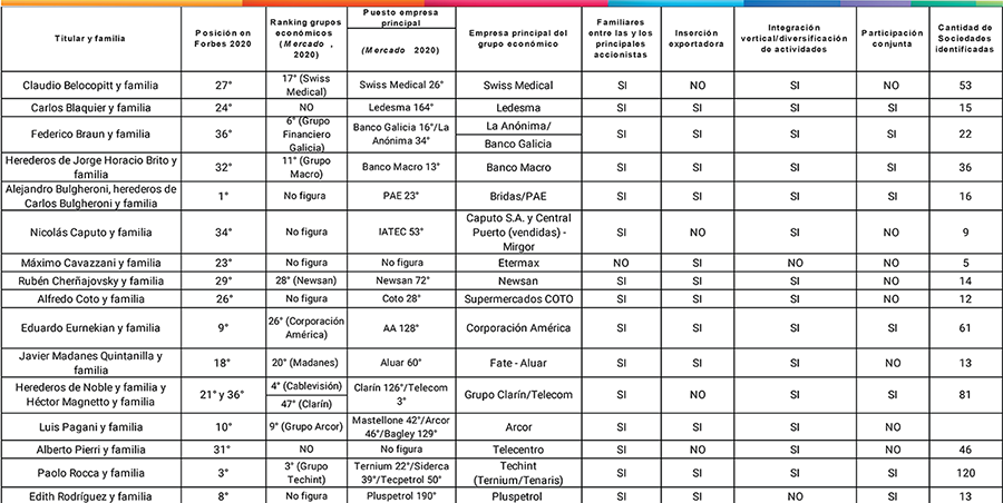 Los 16 casos estudiados permiten ilustrar el perfil y rol en la economía de los entramados empresariales de sus titulares y familia, dado que representan una buena parte de los más importantes empresarios y empresarias argentinos (tanto en los listados de Forbes como de la Revista Mercado), con firmas principales ampliamente conocidas. Prácticamente todos los perfiles analizados incluyen entre las y los accionistas a sus propios familiares.