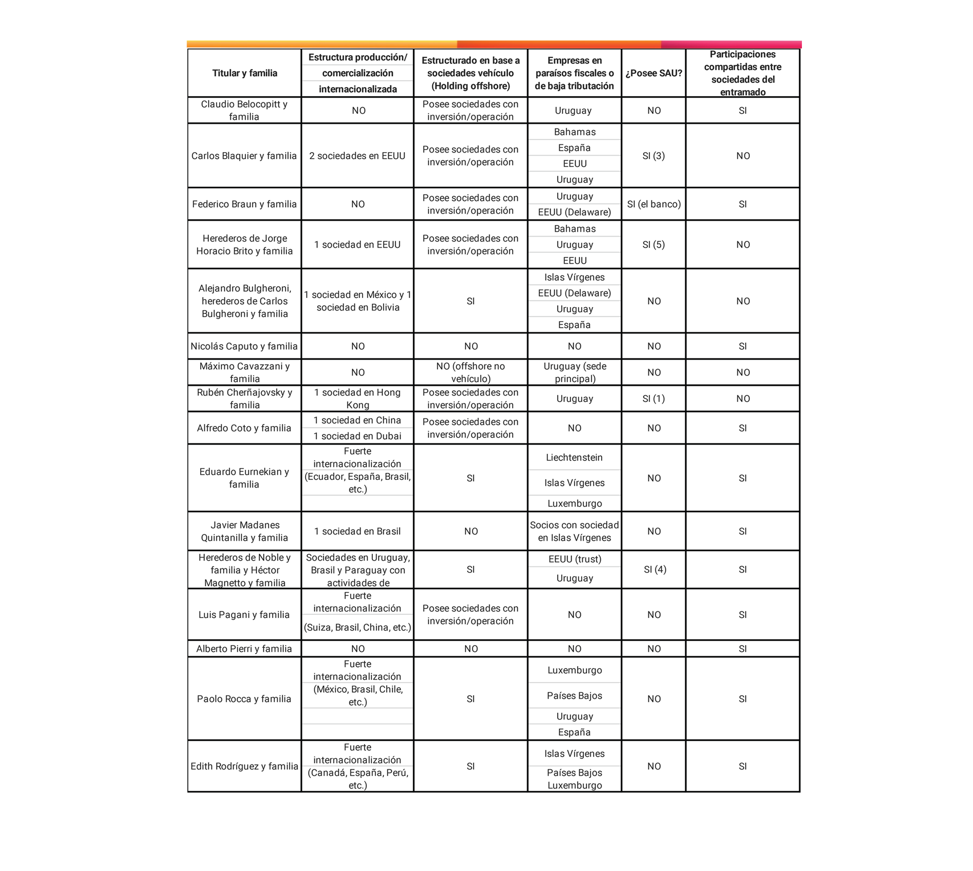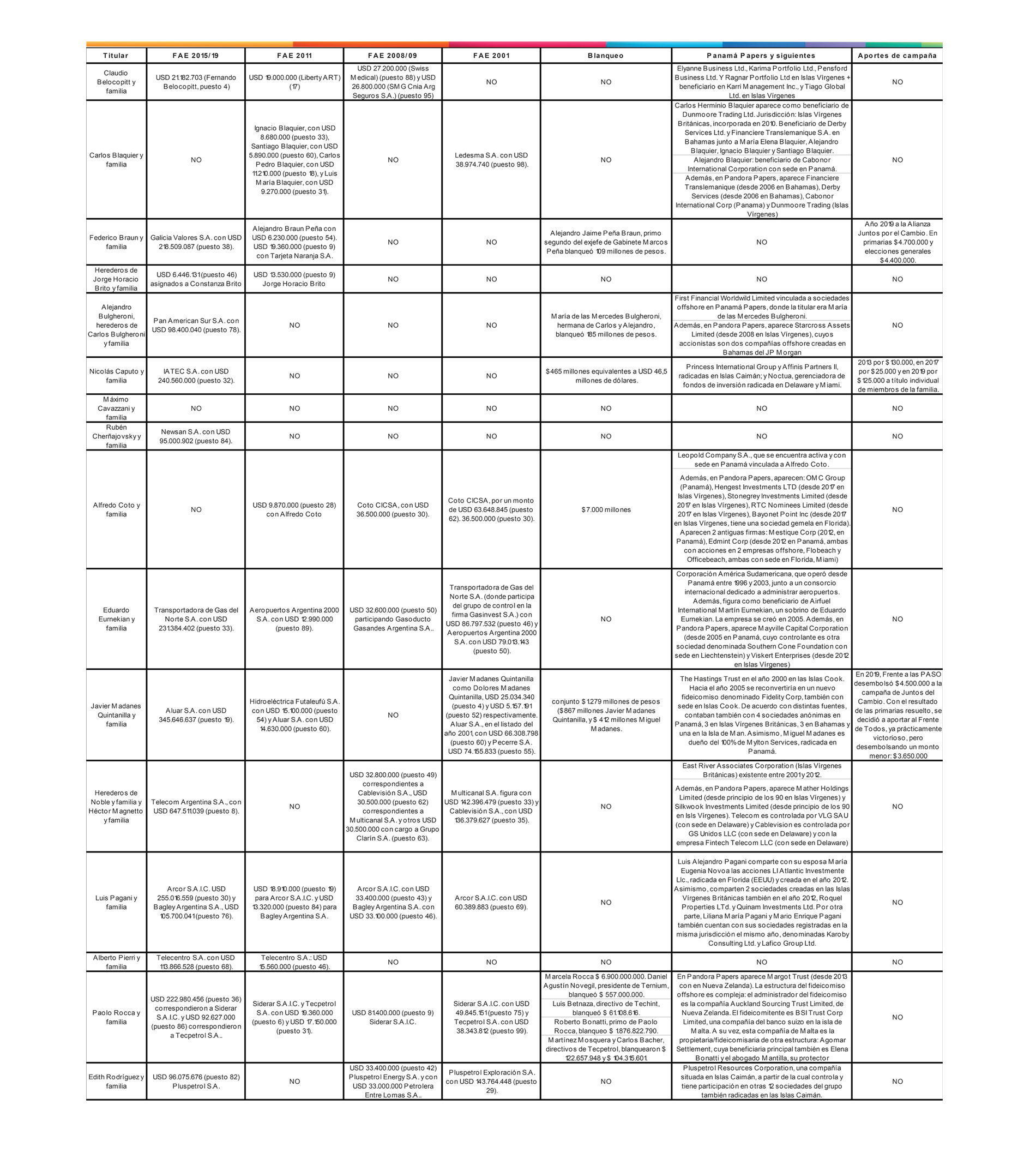 - 11 de los 16 casos analizados aparecen en Panamá Papers y demás filtraciones de información. Corresponden a las familias Belocopitt, Blaquier, Bulgheroni, Caputo, Coto, Eurnekian, Madanes Quintanilla, herederos de Noble y Magnetto, Pagani, Rocca y Edith Rodríguez.