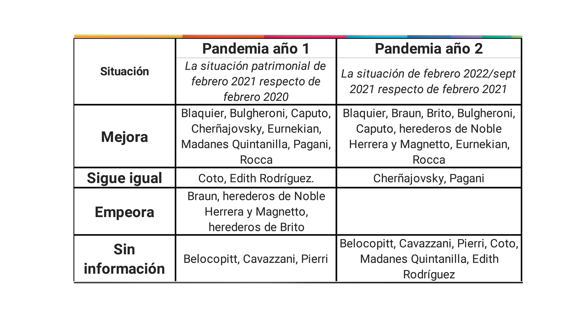 - Sin información: Belocopitt, Cavazzani, Pierri, Coto, Madanes Quintanilla, Edith Rodríguez.