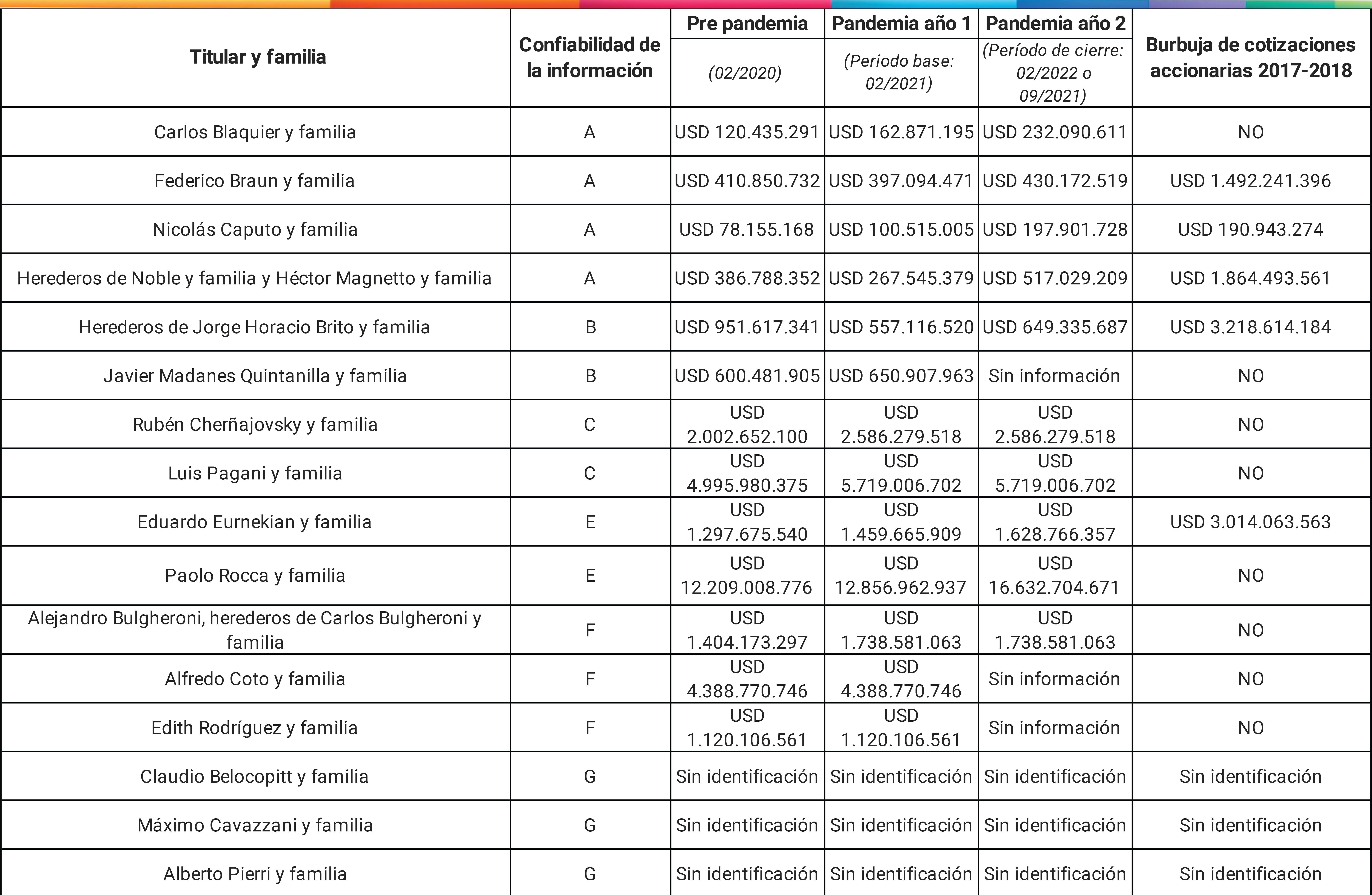 - 4 casos fueron catalogados como A, es decir, se constató una porción significativa de la participación accionaria de la familia a través de empresas que cotizan en Bolsa, por lo que la valuación resulta muy representativa. El monto de patrimonio comercial estimado en este segmento ascendió a USD 996 millones en prepandemia (02/2020), a USD 928 millones en el período base (02/2021), y USD 1.377 millones en el período de cierre (02/2022). Son los casos de Blaquier, Braun, Caputo y herederos de Noble Herrera y Magnetto y las familias respectivas.