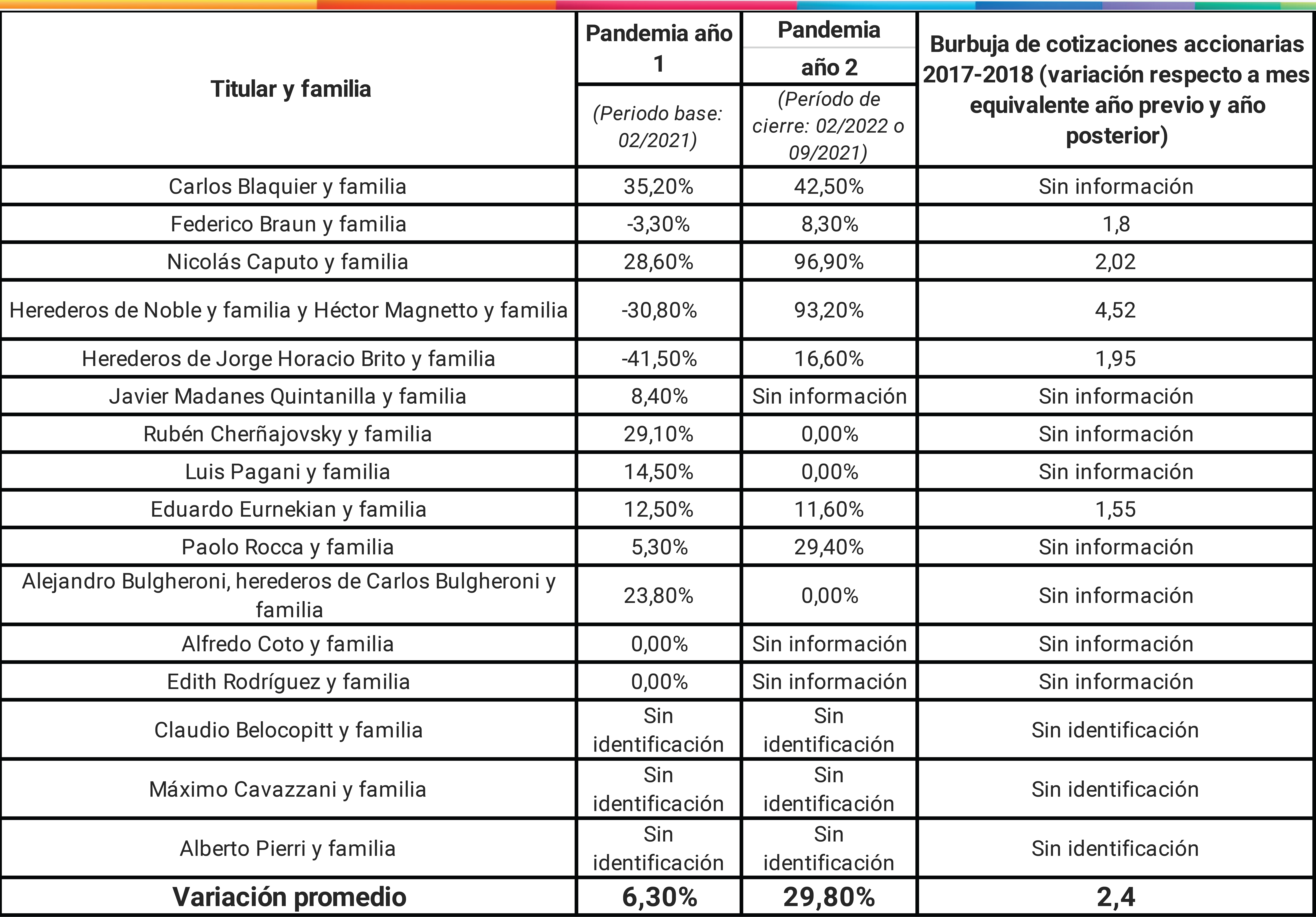 - Otros cuatro entramados redujeron su valor entre febrero 2020 y febrero 2021: Braun, herederos de Noble Herrera y Magnetto, herederos de Brito y las familias respectivas.