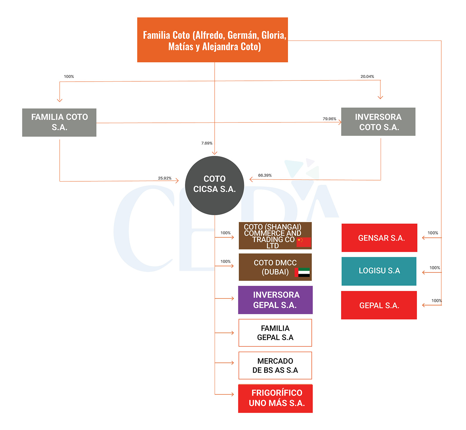 Adicionalmente, en la reconstrucción del entramado empresarial se puede constatar la existencia de cuatro empresas relacionadas a Coto CICSA SA, pero no se pudo identificar el porcentaje de participación. Ellas son Inversora Gepal SA, Familia Gepal SA, Mercado de Buenos Aires SA y Frigorífico Uno Más SA. Incluso, en dos de ellas, no fue posible identificar la actividad que realizan. Además, aparecen dos sociedades recientes, una en China y otra en Dubai, que según ha declarado el propio Alfredo Coto, se trataría de oficinas comerciales. Coto CICSA es la controlante en su totalidad de Coto (Shangái) Commerce And Trading Co. LTD que realizaría comercialización de productos alimenticios (principalmente carne congelada) y de Coto DMCC (Dubai), que se dedicaría a la importación de pollo y carne de los frigoríficos de la empresa.
