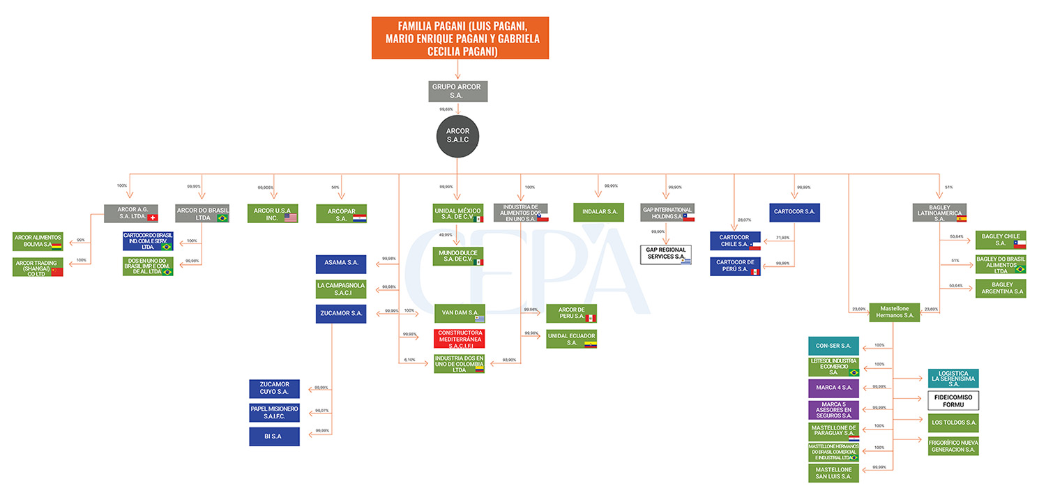 La estructura se organiza a través del Grupo Arcor SA, controlante casi al 100% de Arcor SAIC. La familia Pagani es propietaria del Grupo Arcor, dueña a su vez de casi la totalidad (99,68%) de las acciones de Arcor SAIC. Es de estimar que esta estructura tenga como objetivo la posibilidad de incorporar socios externos a su cabeza, una práctica habitual en las familias preocupadas por el traspaso generacional este tipo de encadenamientos societarios. la tenencia familiar se concentra de la empresa cabecera, y a través de ello, las decisiones que se toman a nivel familiar llegan al resto del Grupo. Se busca también impedir que posteriores generaciones se vayan desprendiendo de sus participaciones, en la medida en que se licuan por procesos sucesorios, de manera de evitar que se vea amenazado por parte de un actor externo el control societario del Grupo. Las discusiones que se pueden llegar a dar en el seno familiar respecto al rumbo del Grupo se consensuan en un nivel superior y “bajan” una vez consensuadas, lo que limita el alcance de las disputas familiares en las operaciones comerciales.