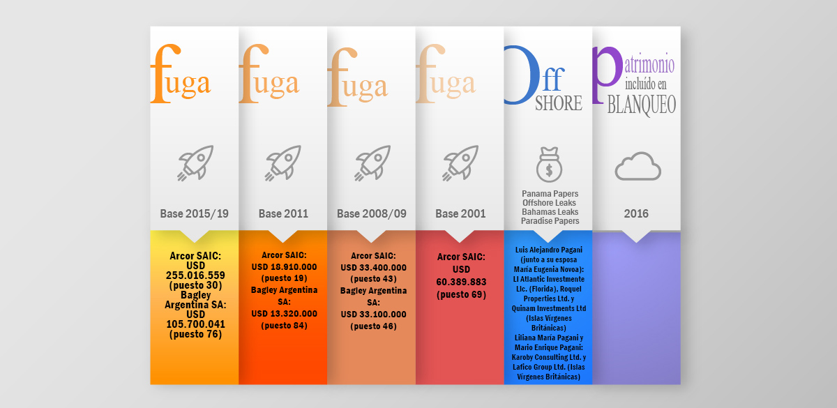 Respecto de formación de activos externos publicados en diversos medios (el detalle de las primeras cien personas humanas y cien personas jurídicas listadas en las publicaciones de 2015 a 2019, la del año 2011, la correspondiente al periodo 2008/2009 y la referida al año 2001), los integrantes de la familia Pagani no figuran en el listado como personas humanas, pero sí con sus sociedades controladas. En el listado correspondiente al año 2001 aparece Arcor SAIC con USD 60.389.883 (puesto 69). En el listado correspondiente al periodo 2008-2009 volvería a aparecer con USD 33.400.000 (puesto 43) y se sumaría Bagley Argentina SA con USD 33.100.000 (puesto 46). En las listas correspondientes al año 2011 aparecen ambas empresas nuevamente, con USD 18.910.000 (puesto 19) para Arcor SAIC y USD 13.320.000 (puesto 84) para Bagley Argentina SA. Finalmente, en el periodo correspondiente a los años 2015-2019 aparecen las mismas empresas, en este caso con USD 255.016.559 (puesto 30) y USD 105.700.041 (puesto 76), respectivamente.