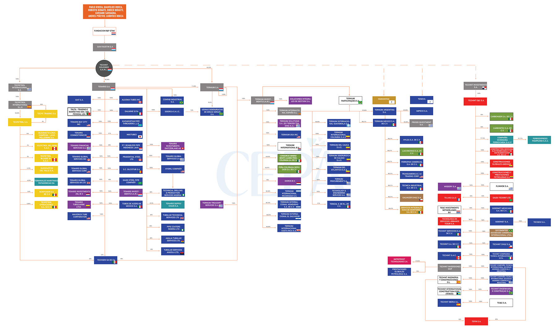 El entramado tiene origen en una fundación con fines benéficos situada en Países Bajos, denominada R&P STAK (por Rocca and Partners Stichting Administratiekantoor Aandelen San Faustin), una entidad privada holandesa que tiene entre sus miembros a Paolo Rocca, Gianfelice Rocca, Roberto Bonatti, Enrico Bonatti, Giovanni Sardagna, Andrés Piñeyro y Ludovico Rocca. En su estatuto indica poseer las acciones de sus depositantes y distribuir dividendos entre ellos (SEC, 2011 (2)), aunque informan que “no existen personas o grupo de personas controlantes de R&P STAK”, es decir, no tiene un beneficiario identificado, o “dueño” identificado. Esta sociedad posee las acciones de San Faustin SA, con sede en Luxemburgo en número suficiente para controlarla (52%). San Faustin controla Techint Holding SARL, y de allí, al resto de las sociedades del Grupo. A partir de este eslabón, el Grupo se estructura en cuatro grandes empresas que son Tecpetrol International SA, radicada en Uruguay, Tenaris SA y Ternium SA, ambas con sede en Luxemburgo, y Techint Investments SA, con sede en Panamá. No se logró reconstruir en el entramado de sociedades el lugar de Tenova ni de Humanitas.