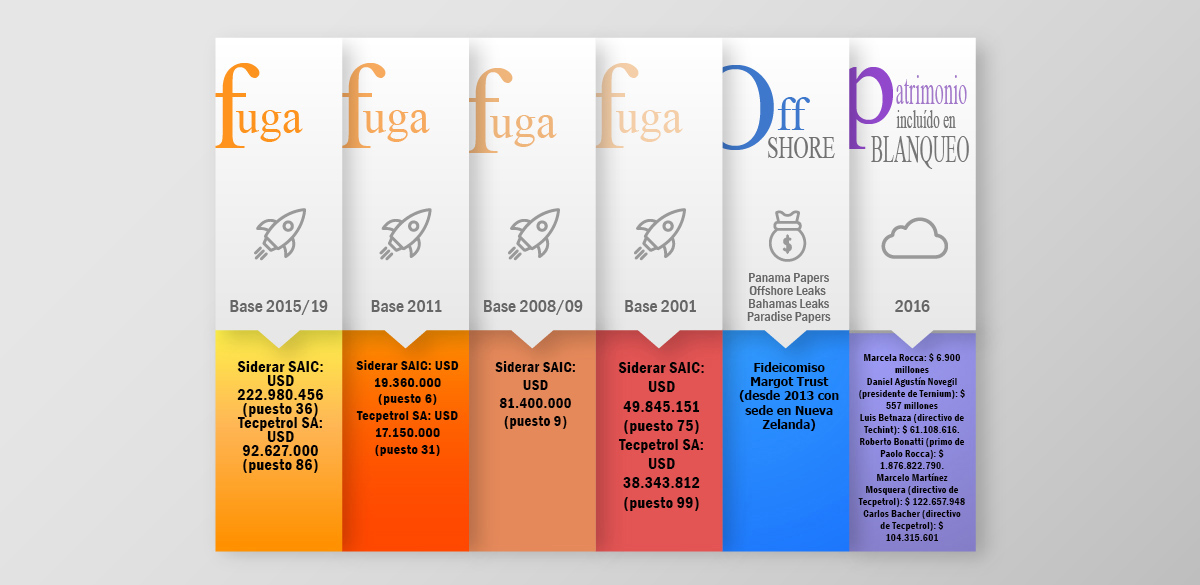 Respecto a la formación de activos externos publicados en diversos medios (el detalle de las primeras cien personas humanas y cien personas jurídicas listadas en las publicaciones de 2015 a 2019, la del año 2011, la correspondiente al periodo 2008/2009 y la referida al año 2001), los integrantes de la familia de Paolo Rocca no figuran en los listados de personas humanas, pero sí aparecieron sus sociedades controladas. En el listado correspondiente al año 2001 aparecen Siderar SAIC con USD 49.845.151 (puesto 75) y Tecpetrol SA con USD 38.343.812 (puesto 99). En el listado correspondiente al periodo 2008-2009 solo aparece con USD 81.400.000 (puesto 9) Siderar SAIC. En las listas correspondientes al año 2011 volverían a aparecer ambas empresas, Siderar SAIC y Tecpetrol SA con USD 19.360.000 (puesto 6) y USD 17.150.000 (puesto 31), respectivamente. En el periodo correspondiente a los años 2015-2019 aparecen ambas nuevamente con USD 315.607.456 en total: USD 222.980.456 (puesto 36) correspondieron a Siderar SAIC y USD 92.627.000 (puesto 86) a Tecpetrol SA.